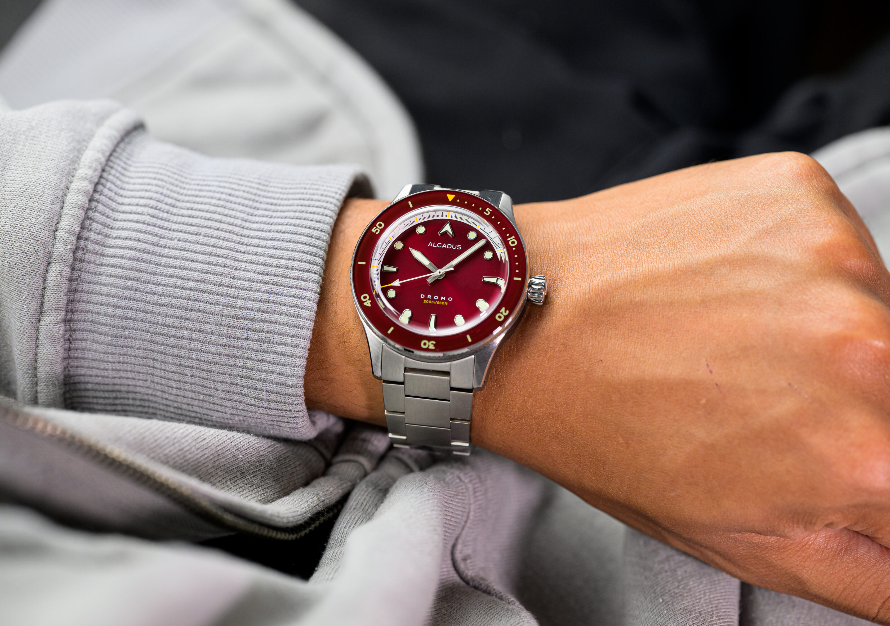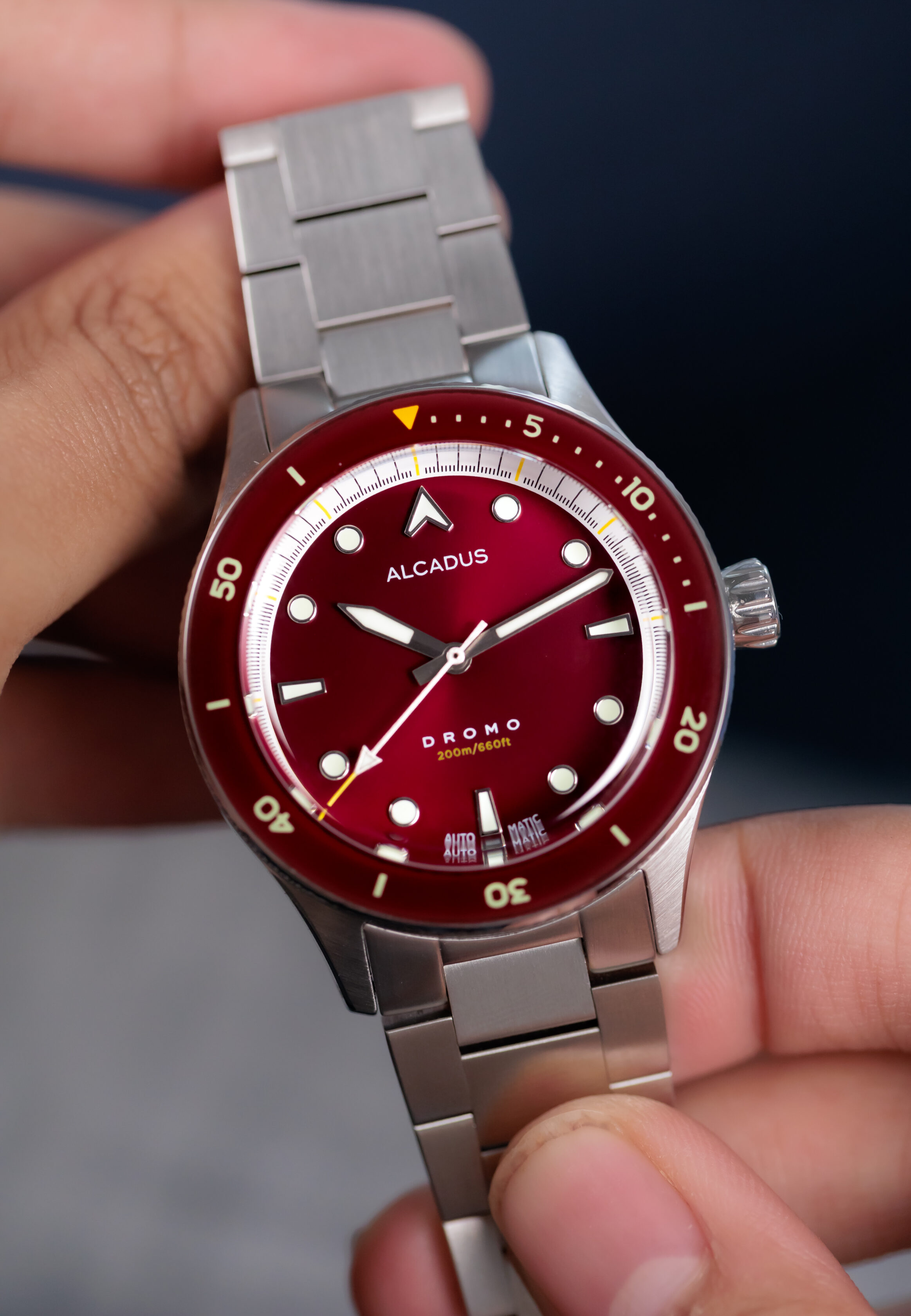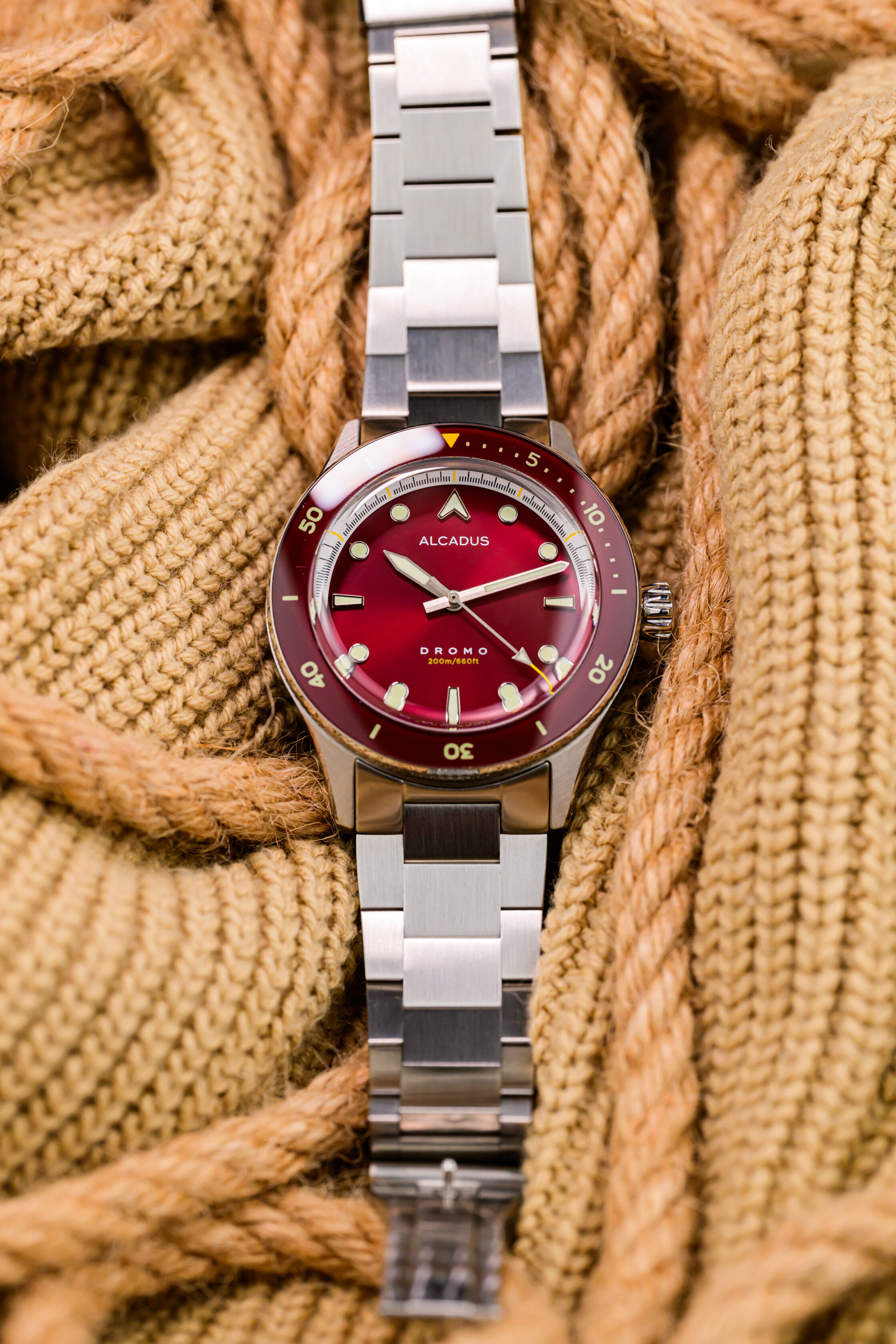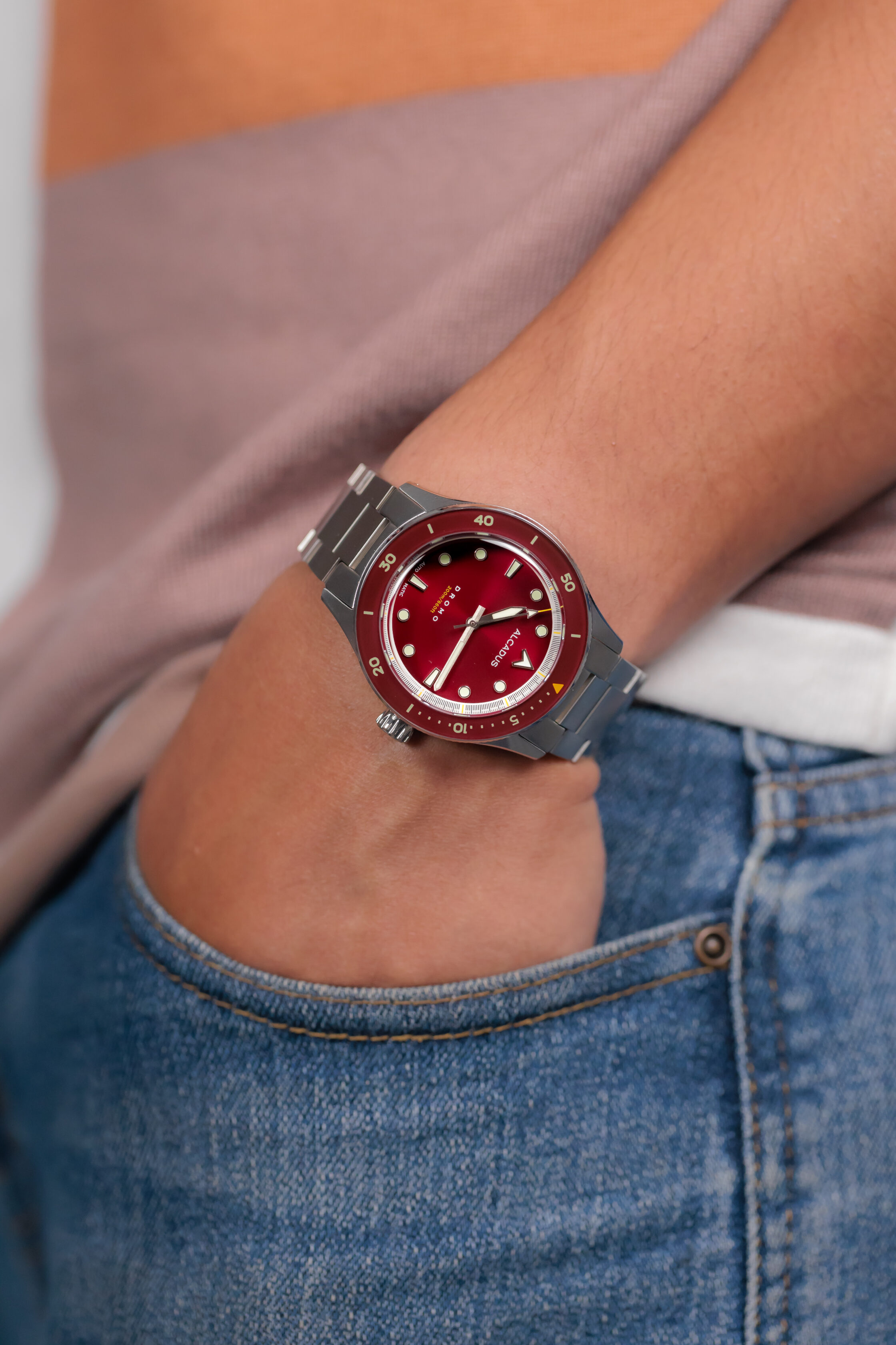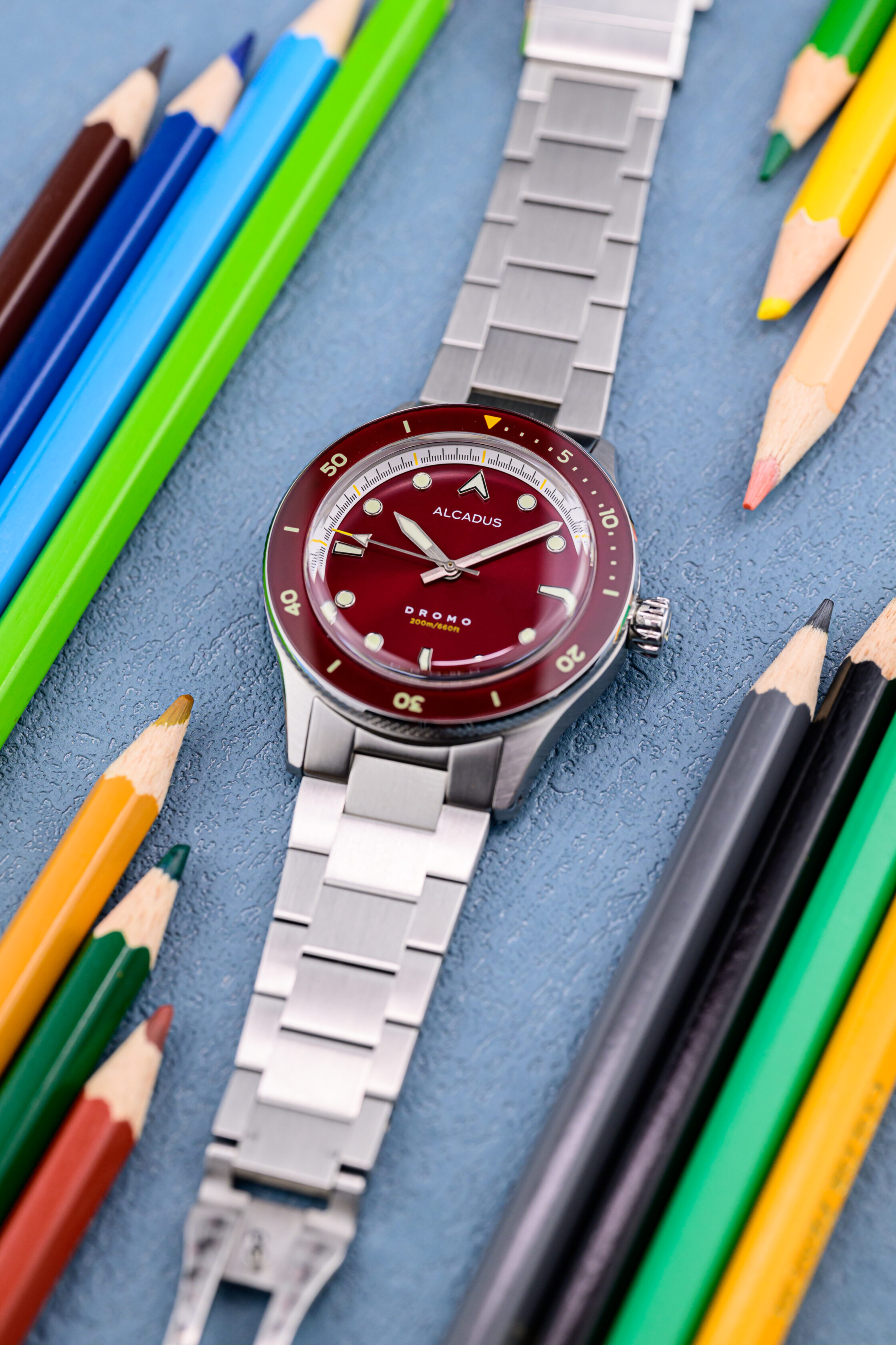 Metallic red sunray dial, with brushed silver steel hands and applied indices. Equipped with lumed sapphire bezel insert. Yellow accent on dials, tip of second hand. Triangle at bezel insert with yellow luminescent pigment.